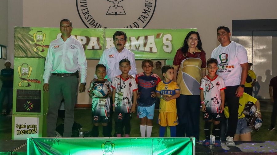 « En el marco del fortalecimiento de la vinculación social y el impulso a la formación integral de la niñez y juventud, el rector de la Universidad Autónoma de Tamaulipas (UAT), Dámaso Anaya Alvarado, inauguró la Copa Kama’s de futbol la noche de este viernes 17 de abril en las instalaciones del Gimnasio Multidisciplinario Mante, espacio universitario que fungió como sede del evento. «