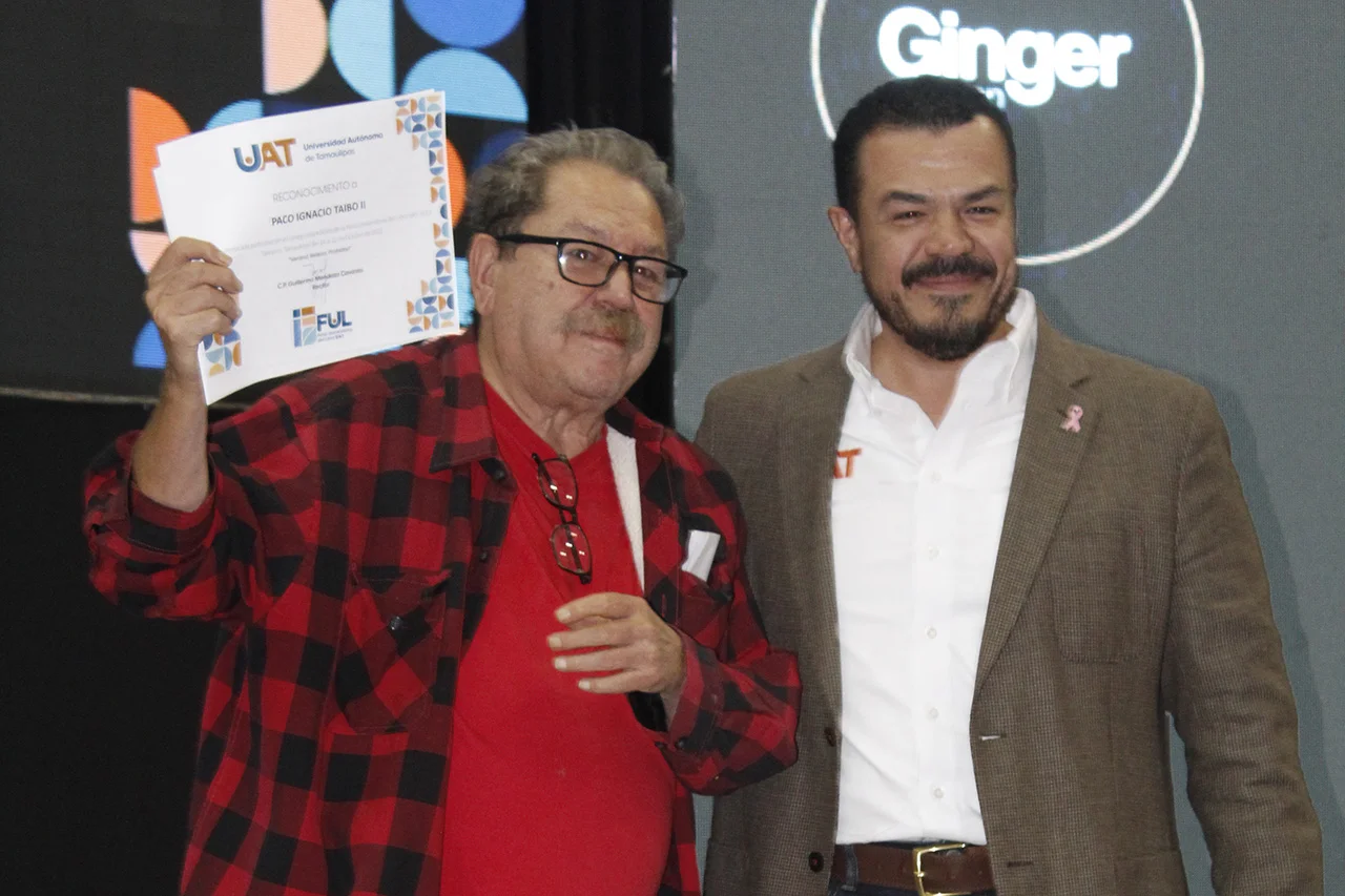 Como muestra de gratitud, el rector Mendoza Cavazos otorgó un reconocimiento a Paco Ignacio Taibo II, agradeciéndole por el constante apoyo del FCE en la expansión de la feria, que hoy llega a ciudades como Nuevo Laredo, Reynosa y Ciudad Victoria.