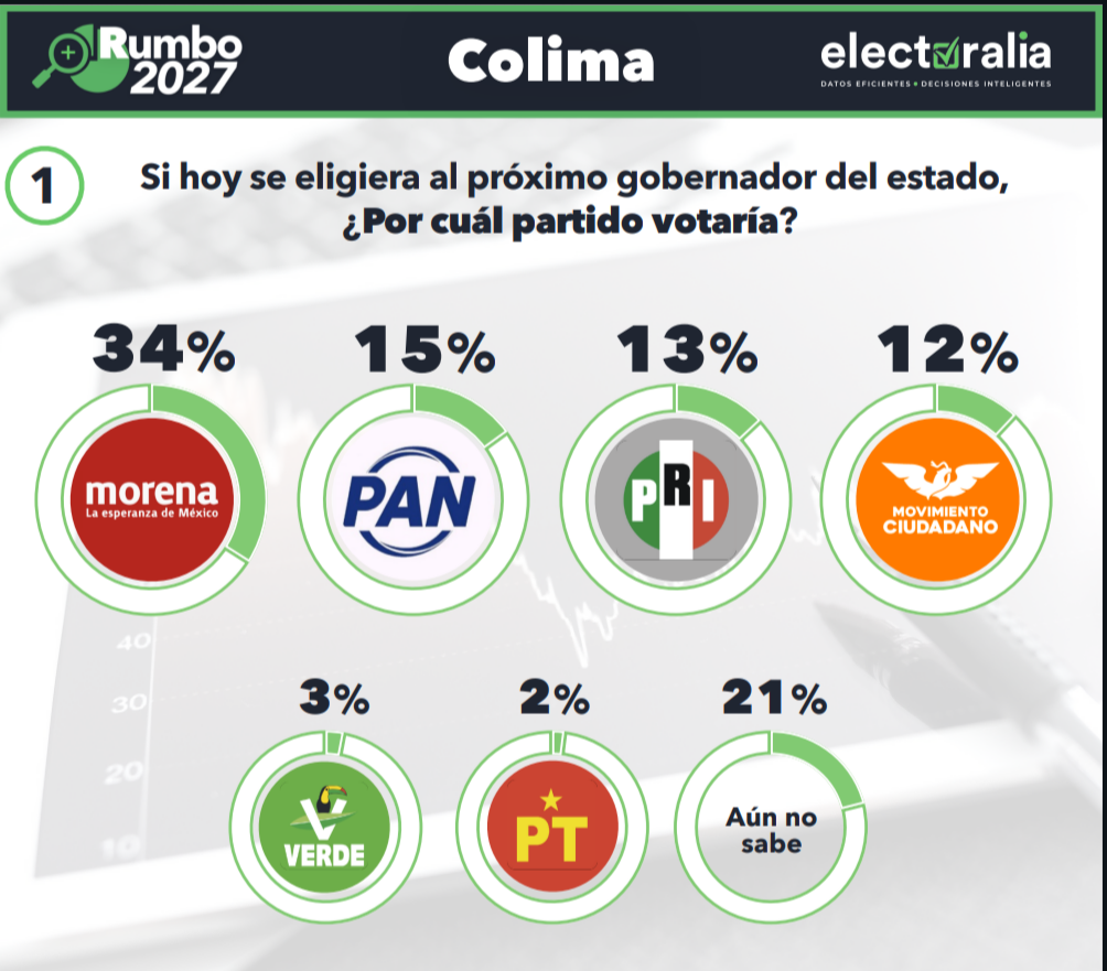 COLIMA: Según estudios realizados del 18 al 23 de abril, con un nivel de confianza estadística del 95%, a la pregunta: Si hoy se eligiera al próximo gobernador del estado ¿Por cuál partido votaría? La respuesta de 2 mil 500 colimenses fue favorable en un 34% para Morena, un 15% para el PAN, un 13% para el PRI, un 12% para Movimiento Ciudadano, 3% para el PVE 2% PT y el 21% dijo no saber por quien votaría el próximo año.