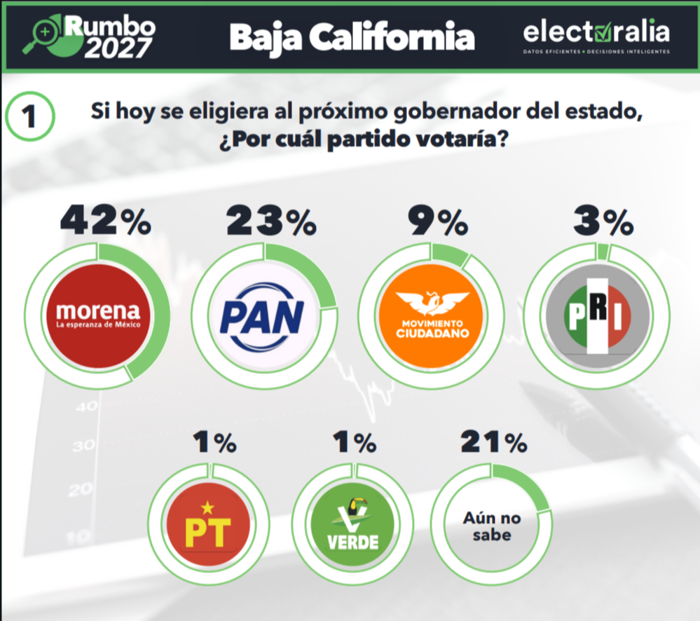 BAJA CALIFORNIA: En estudios realizados del 18 al 22 de abril, con un nivel de confianza estadística del 95%, a la pregunta: Si hoy se eligiera al próximo gobernador del estado ¿Por cuál partido votaría?, la respuesta de las entrevistas de 2 mil 500 bajacalifornianos fue favorable para Morena en un 42%, el PAN obtiene un 23%, Movimiento Ciudadano el 9%, el PRI un 3%, el PT 1%, el PVE 1% y el 21% respondió que no sabe.