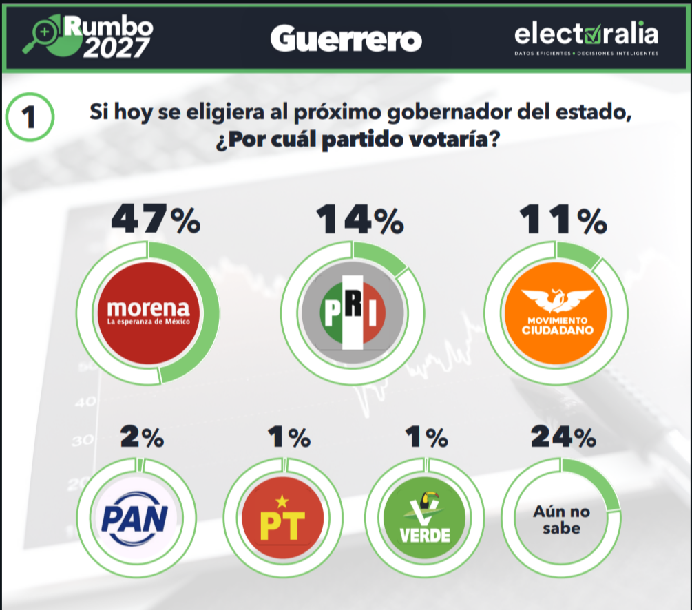 GUERRERO: En la encuesta realizada del 18 al 22 de abril, con un nivel de confianza estadística del 95%, a la pregunta: Si hoy se eligiera al próximo gobernador del estado ¿Por cuál partido votaría?, la respuesta de las entrevistas de 2 mil 500 guerrerenses es favorable para Morena en un 47%, 14% para el PRI, Movimiento Ciudadano alcanza un 11%, el PAN 2%, PT 1%, PVE 1% y el 24% respondió que no sabe.