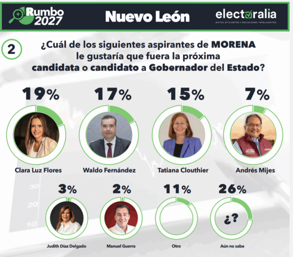 Respecto a quien les gustaría que fueran los candidatos también está muy reñido el panorama especialmente en Morena que prefieren a Clara Luz Flores el 19%, a Waldo Fernández el 17%, a Tatiana Clouthier el 15%.