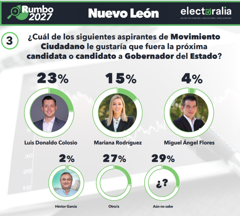 En Movimiento Ciudadano el senador Luis Donaldo Colosio está a la cabeza con 23% de las preferencias por el 15% de Mariana Rodríguez, la esposa del gobernador.