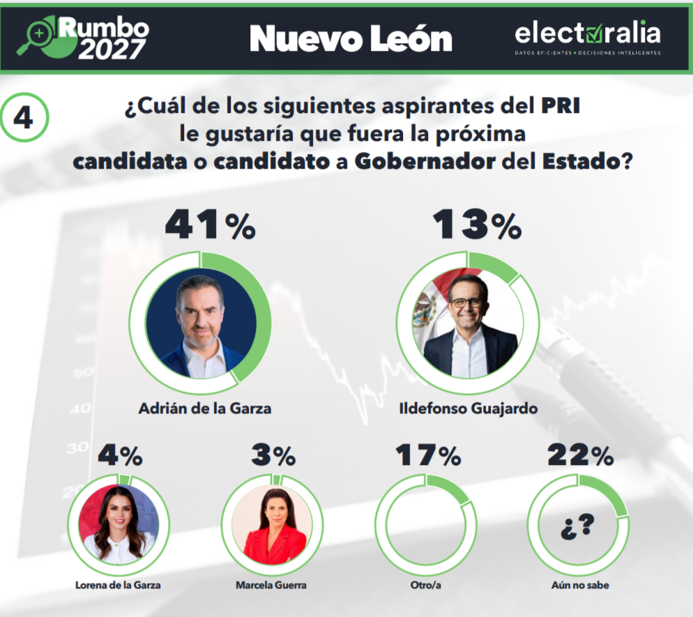 En otro frente Adrián de la Garza se posiciona con el 41% de las preferencias para ser candidato del PRI e Idelfonso Guajardo con el 13%